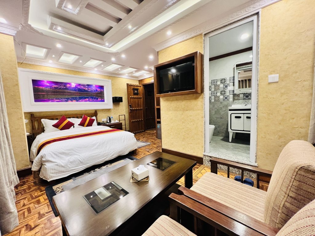 Perfect for solo travelers, our Single Bed Room offers a cozy yet spacious stay with a king-size bed, attached bathroom, and air conditioning for your comfort. Enjoy modern amenities like a mini fridge, satellite TV, complimentary coffee, and a water kettle. With 24/7 hot and cold water, free WiFi, a locker safety box, and a writing desk with a sofa, it’s an ideal choice for both rest and productivity.
